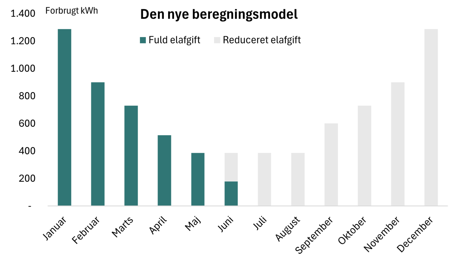 Med den tidligere beregningsmodel betaler en kunde fuld elafgift af 4.000 kWh jævnt fordelt på 12 måneder svarende til en elafgift af 333 kWh pr. måned. Med en elafgift på 72 øre/kWh i 2025 (ekskl. moms), vil det svare til 240 kr. pr. måned i elafgift for alle måneder.
