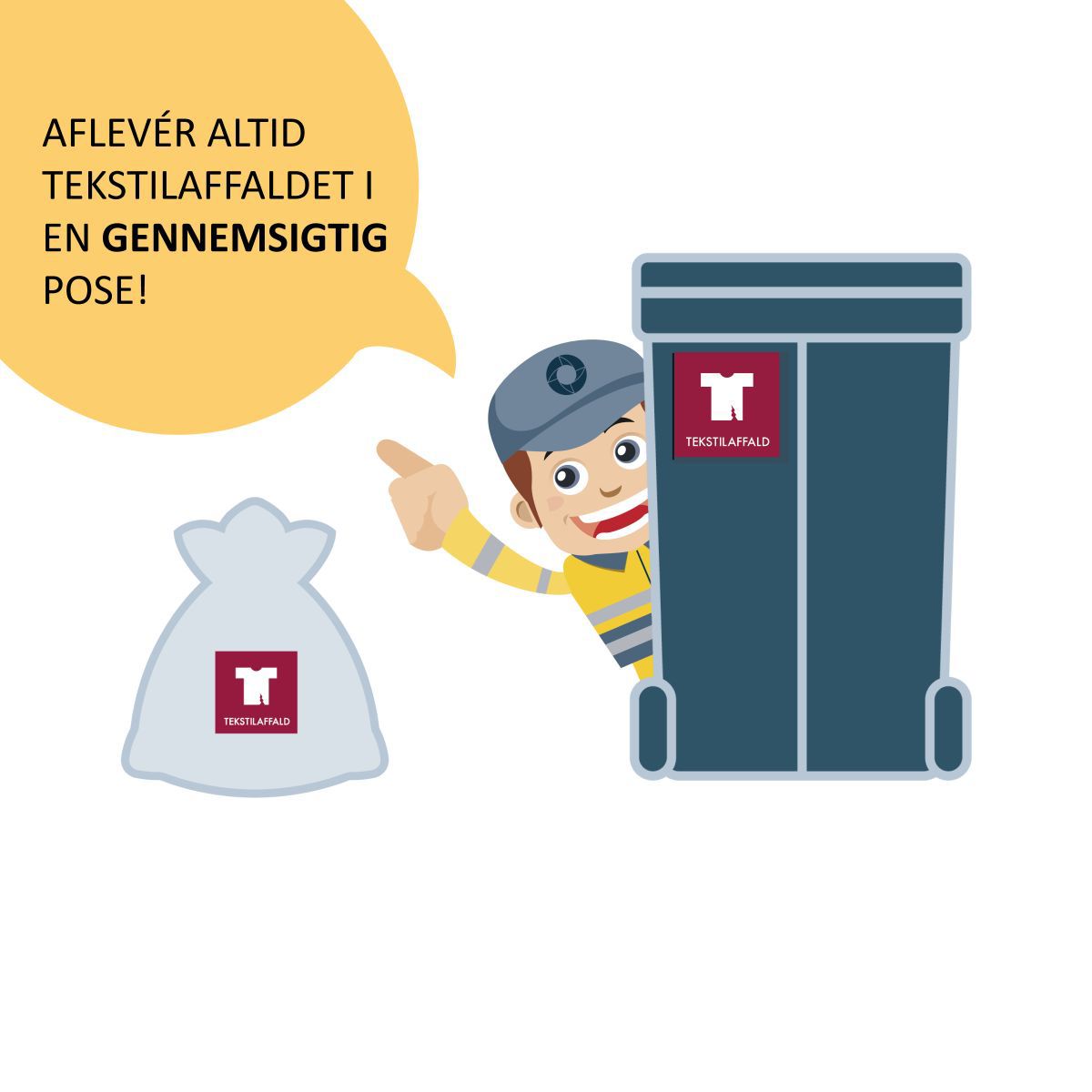 - Tekstiler skal sorteres særskilt, da tekstil som strømpebukser og undertøj kan sætte sig