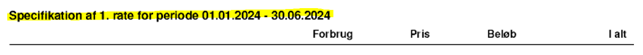 På den første regning, du modtager, hvor du kan se opgørelsen over dit forbrug for 2023, opkræver vi for perioden 1. januar – 30. juni 2024, og derfor er beløbet større. På regningen vil der fremgå ”1. acontorate 2024” og ”Specifikation for 1. rate for periode 01.01.2024 – 30.06.2024.