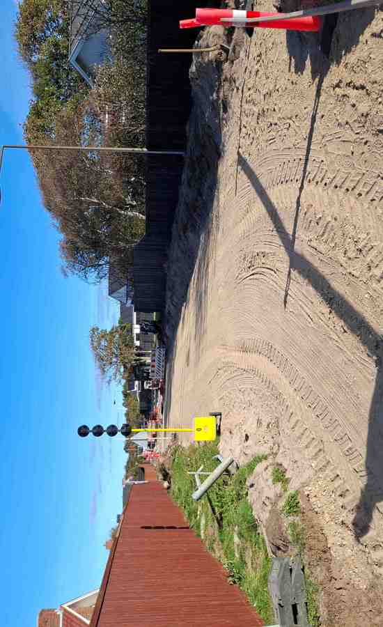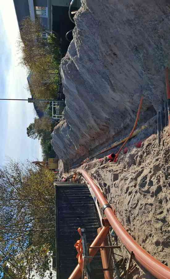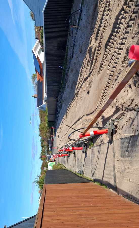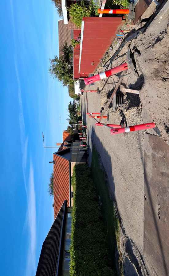 Entreprenøren er nu kommet i gang med anlægsarbejderne. Hans mandskab er i gang mange steder på samme tid, da vi er bagud den oprindelige tidsplan, og da arbejderne kræver det.